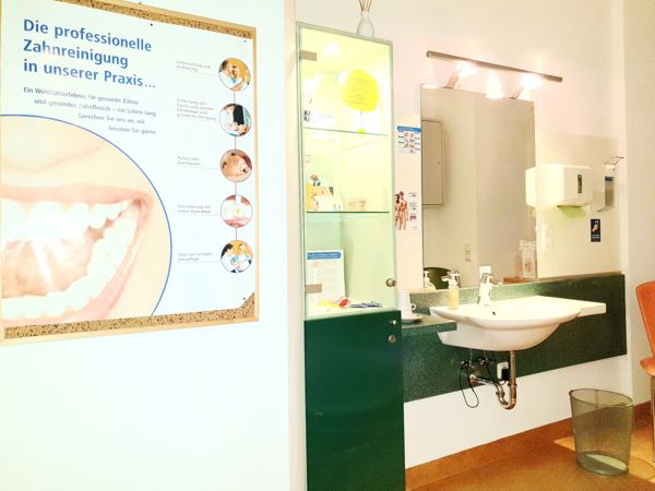 Sie sind eingeladen unseren Zahnputzraum zu nutzen: Sei es um besprochene Zahnpflege-Produkte auszuprobieren, oder um kurz vor Ihrem Termin nochmals Zähne zu putzen: Zahnputzraum beim Eingangsbereich im Vorraum – Einmalzahnbürsten, Becher und Zahnseide stehen bereit.